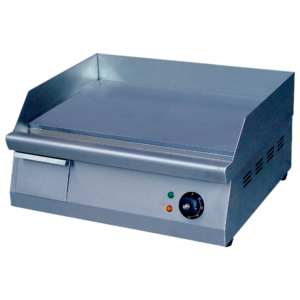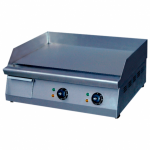 Plancha a cas de acero laminado 600×600 mm, con mueble de acero inoxidable y con aristas redondeadas, para facilitar su limpieza.